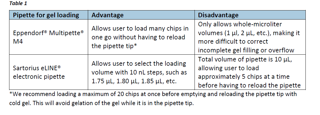 c. Start by loading 2 μL gel per gel inlet