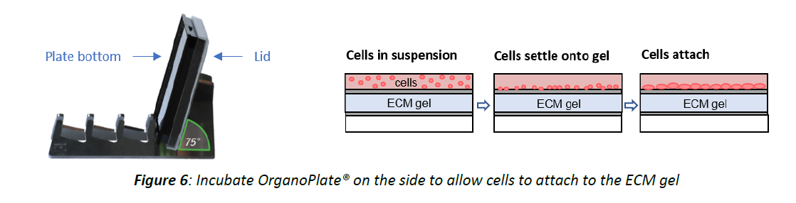7. Place the OrganoPlate® on its side in the MIMETAS plate stand for 3-4 hours in the incubator to allow the cells in the top channel to settle onto the ECM gel and attach (see figure 6).
