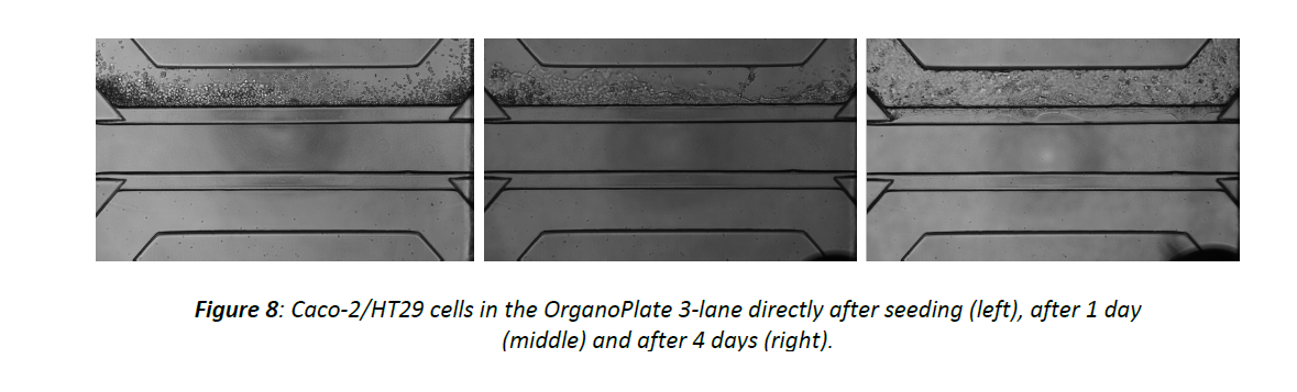 Seeding of a co-culture of Caco-2/HT29-MTX-E12 cells against extracellular matrix (ECM) gel in an OrganoPlate® 3-lane.