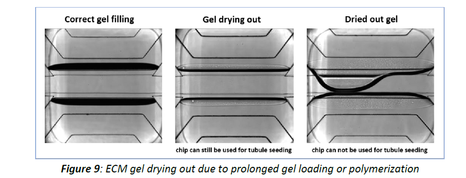 In some cases, the ECM gel can dry out during the gel loading and polymerization process (figure 9). This generally happens when the gel loading process takes longer than expected and the gel in the chips that were loaded first has been incubated much longer than the gel in the chips that were loaded last. When loading goes smoothly, this problem doesn’t occur. However, if loading takes longer than expected (> 10 min), check regularly under the microscope to see if the gel starts to dry out and if you observe that it is, quickly add HBSS to the gel inlet of those chips to prevent further drying.