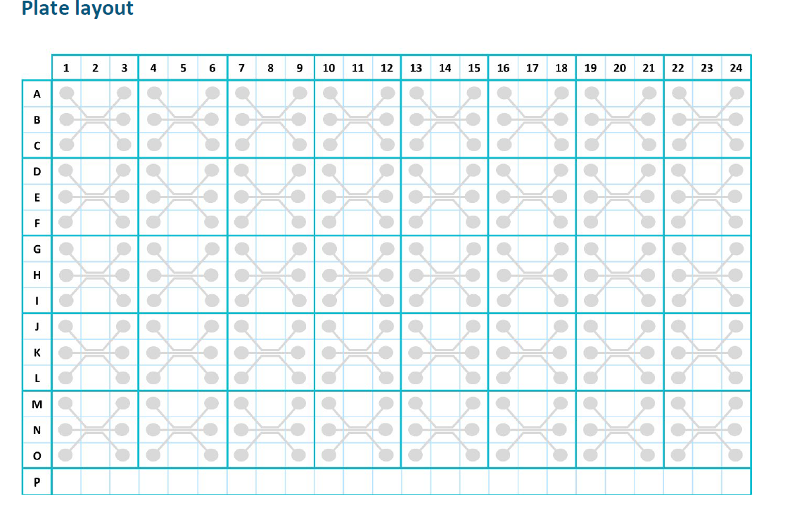 10. Add 50 μL of medium to the bottom medium outlet (columns 3, 6, 9, 12, 15, 18, 21, 24; rows C, F, I, L, O)