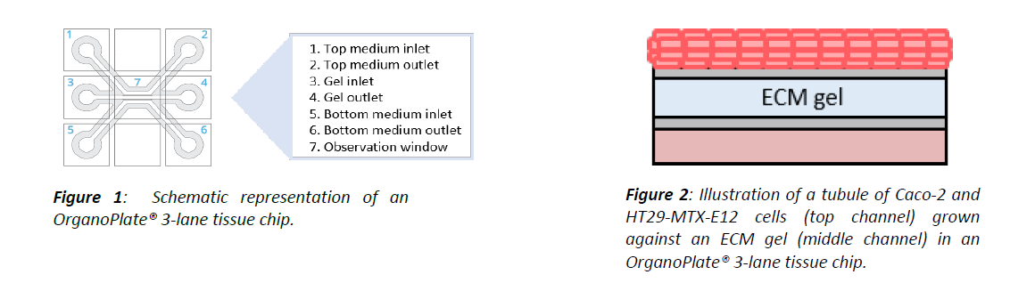 Tubular structures, such as endothelial or epithelial barrier tissues, are established in the OrganoPlate® by growing cells against an ECM gel. Morphology and function of the tubule can be assessed by microscopy, a barrier integrity assay, or other functional assays. This protocol describes the culturing of a tubule of Caco-2 and HT29-MTX-E12 cells against ECM in the top lane of an OrganoPlate® 3-lane (see figure 1 and 2). The resulting tubular culture allows for access to apical and basal side of the barrier tissue.