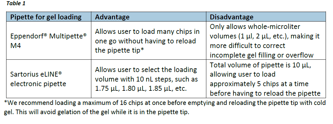 Both the Eppendorf® Multipette® M4 and the Sartorius eLINE electronic pipette can successfully be used to load gel in the OrganoPlate®. Table 1 shows an overview of each pipette’s advantages and disadvantages for gel loading.