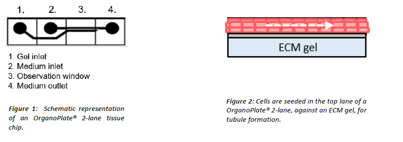 This protocol describes the culture of a tubule against ECM in the top lane of an OrganoPlate® 2-lane (see figure 1 and 2). In case both apical and basal access to the tubule are required for your experiment, the OrganoPlate® 3-lane should be used (see protocol OrganoPlate® 3-lane tubule seeding).