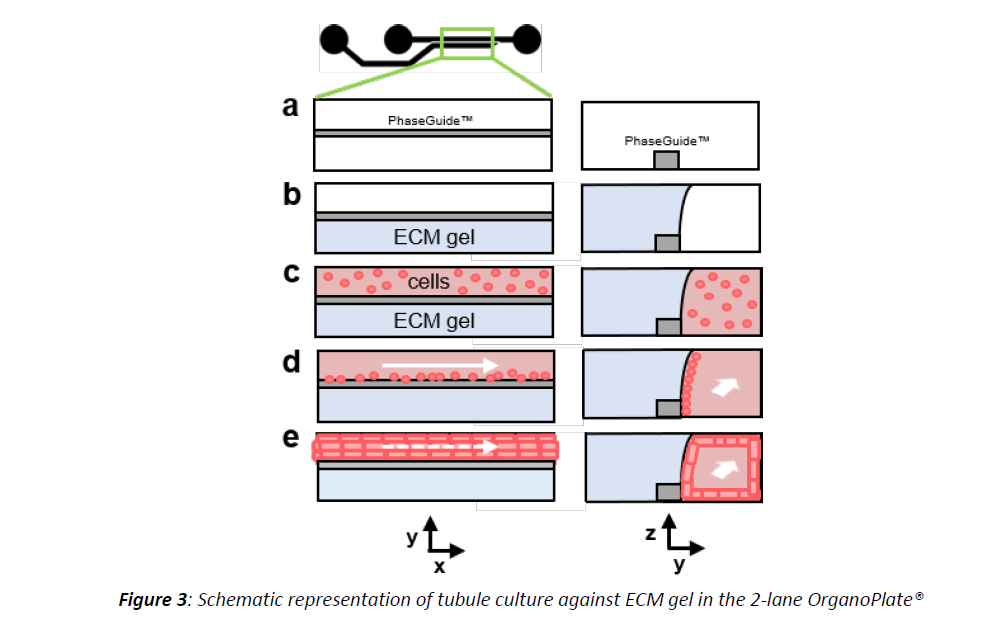 Seeding of cells against extracellular matrix (ECM) gel in an OrganoPlate® 2-lane for tubule formation.